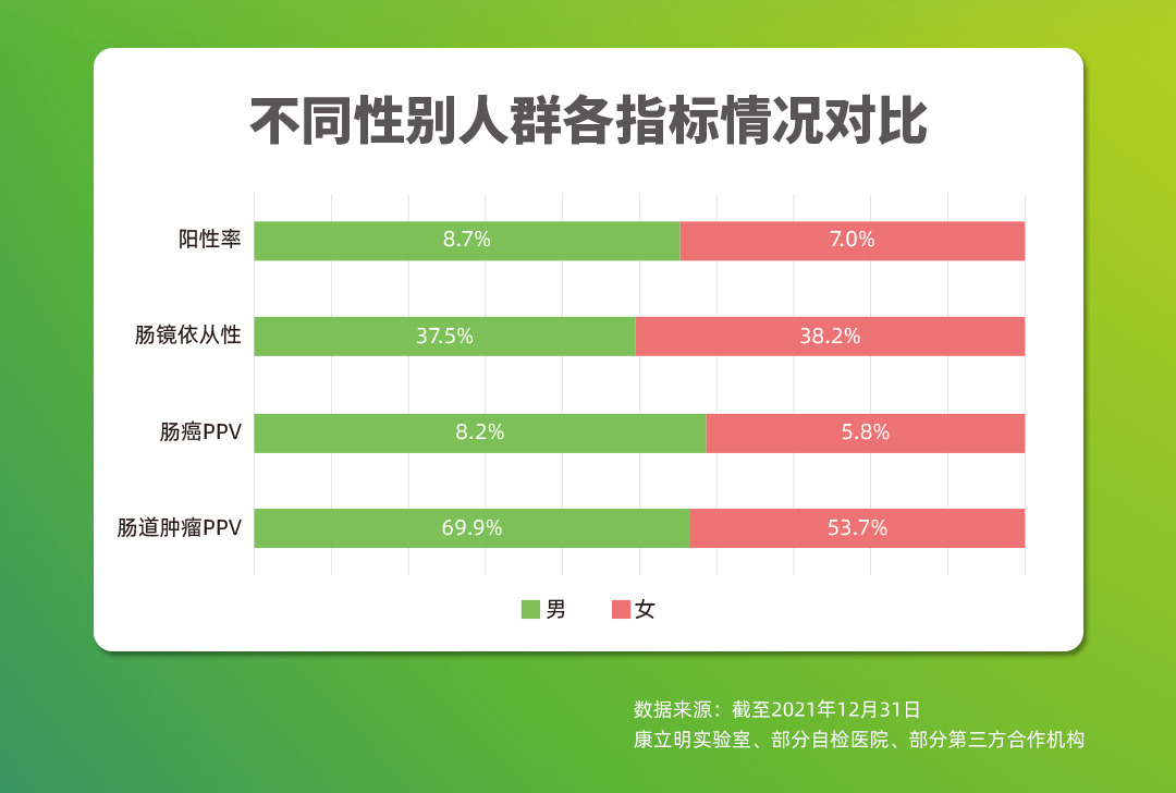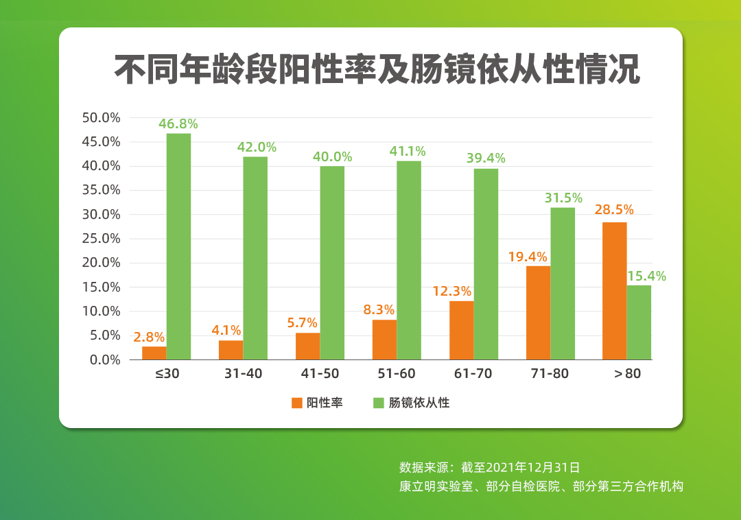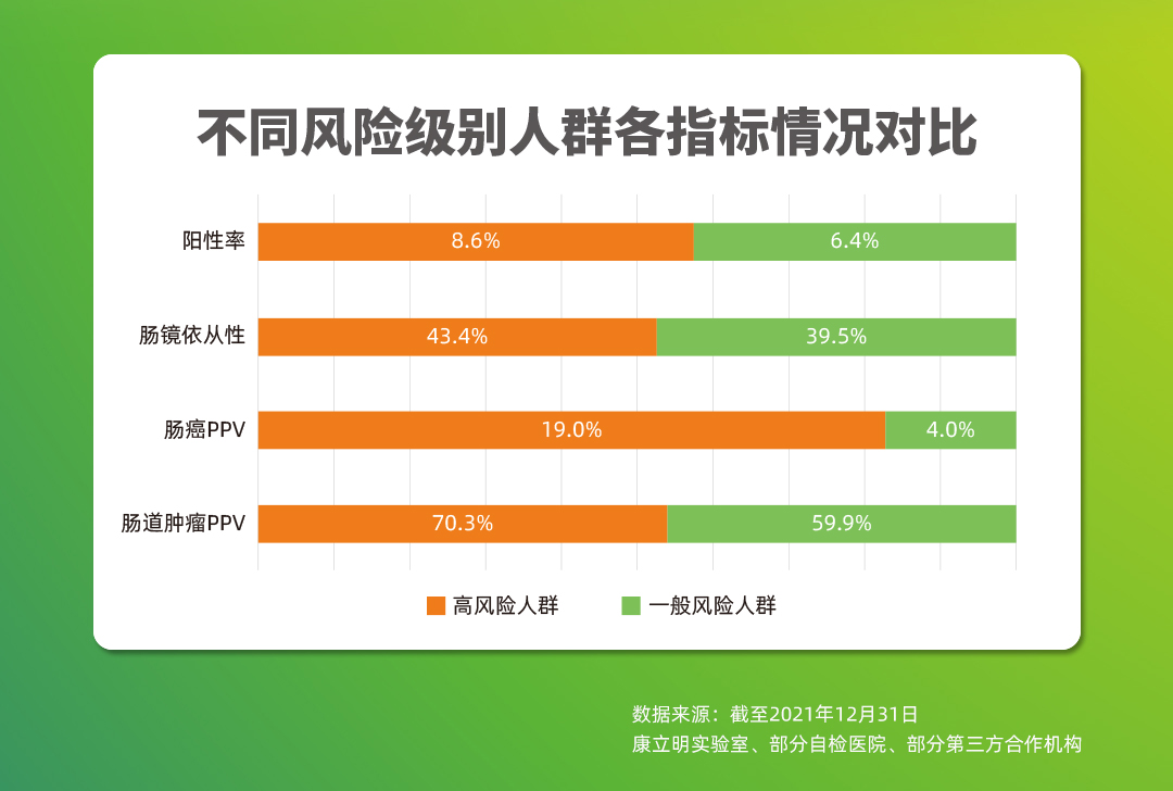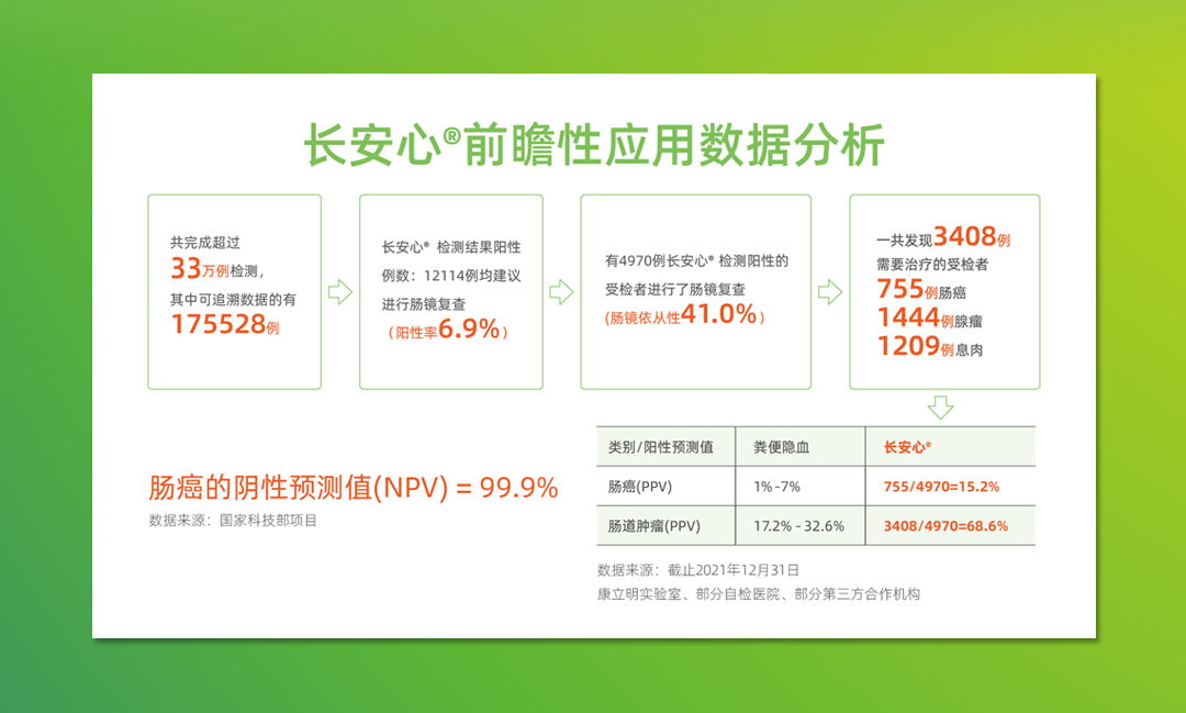 截至2021年12月,作為持續(xù)披露真實(shí)世界應(yīng)用數(shù)據(jù)的腸癌糞便基因檢測(cè)產(chǎn)品,長(zhǎng)安心®共完成33萬例前瞻性應(yīng)用檢測(cè),其中175528例應(yīng)用數(shù)據(jù)可追溯,12114例受檢者長(zhǎng)安心®檢測(cè)結(jié)果陽性(陽性率6.9%),其中4970例長(zhǎng)安心®檢測(cè)結(jié)果陽性的受檢者進(jìn)行了腸鏡復(fù)查(腸鏡依從性41.0%),一共發(fā)現(xiàn)3408例需要治療的受檢者,其中755例腸癌,1444例腺瘤,1209例息肉。長(zhǎng)安心®對(duì)腸道腫瘤的預(yù)測(cè)值(PPV)為68.6%(其中腸癌的陽性預(yù)測(cè)值為15.2%),來自國(guó)家科技部項(xiàng)目的數(shù)據(jù)顯示,長(zhǎng)安心®的陰性預(yù)測(cè)值更是高達(dá)99.9%。