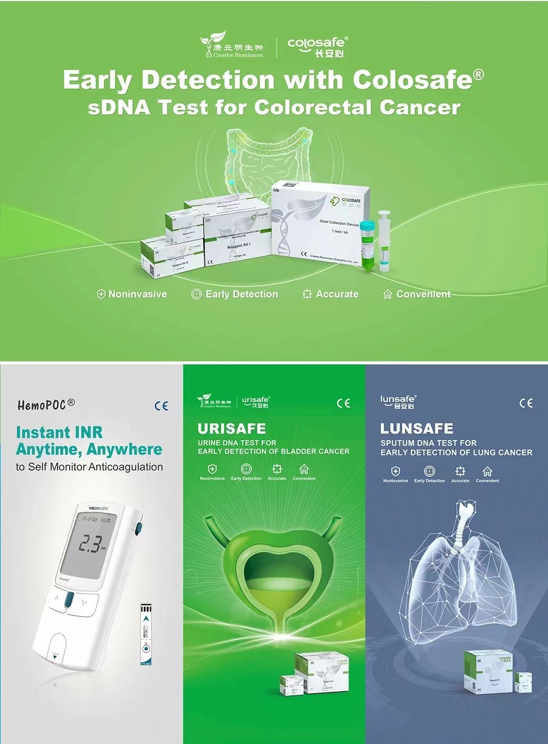 本次盛會(huì),康立明生物攜長安心®糞便DNA腸癌檢測(cè)、久安心®膀胱癌基因檢測(cè)、會(huì)安心®肺癌基因檢測(cè)、全自動(dòng)樣本預(yù)處理儀以及康立明全資子公司好芝生物產(chǎn)品HelixPOC®全自動(dòng)微流控?zé)晒?/span>PCR一體機(jī)、HemoPOC®凝血檢測(cè)系統(tǒng)赴展。
