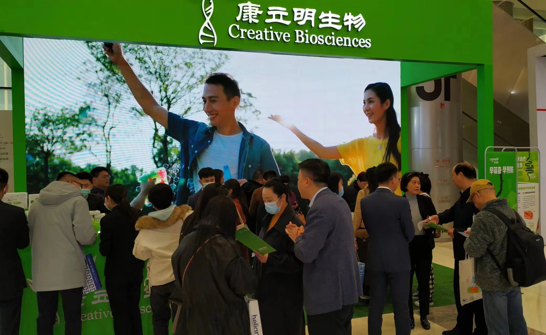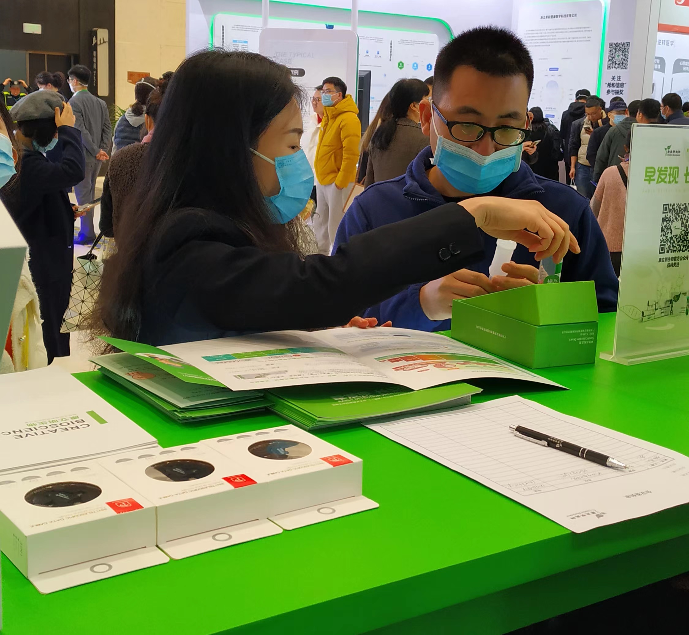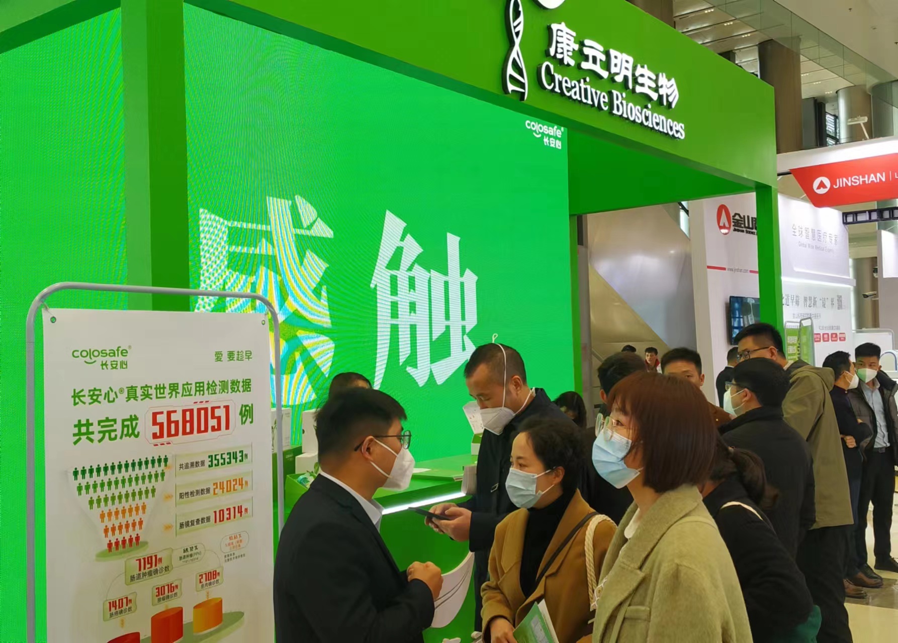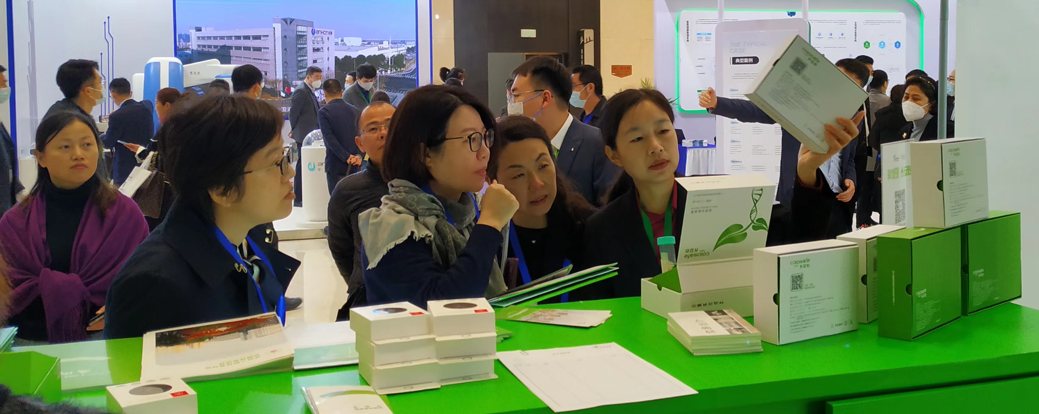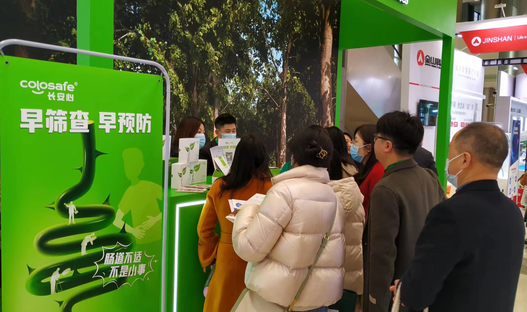 康立明生物攜長(zhǎng)安心®糞便DNA腸癌檢測(cè)產(chǎn)品參展??盗⒚魃镎刮灰源笞匀粸樵?,以代表生命和萬(wàn)物生長(zhǎng)的綠色為抽象概念,構(gòu)建出一個(gè)Green Box,與現(xiàn)場(chǎng)展出的長(zhǎng)安心®小盒子,在形態(tài)到寓意上相呼應(yīng),吸引了眾多專家、嘉賓到康立明生物展位打卡、交流,探討長(zhǎng)安心®為健康管理系統(tǒng)提供的價(jià)值與成效。