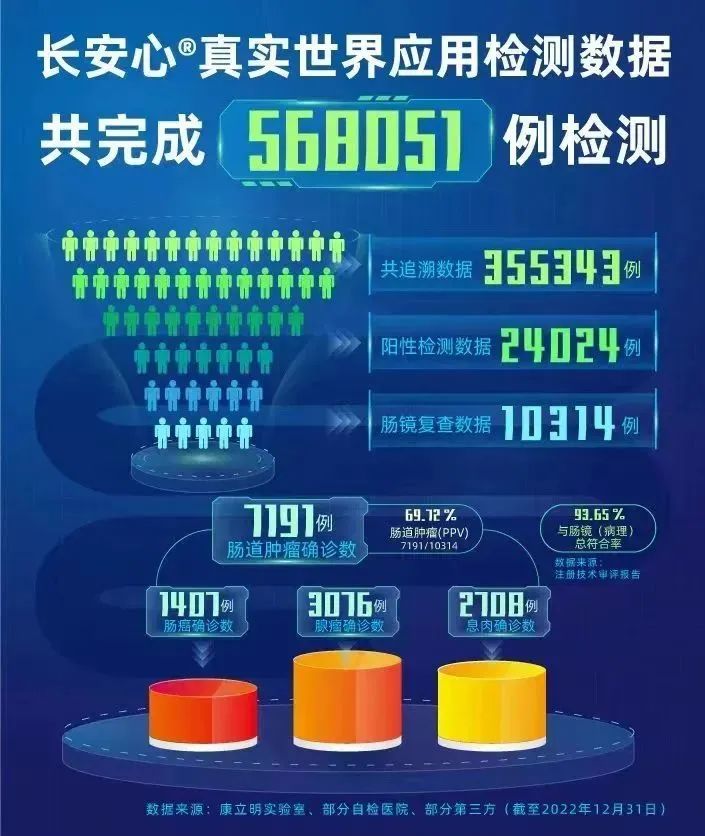 作為持續(xù)披露真實(shí)世界應(yīng)用數(shù)據(jù)的腸癌糞便基因檢測(cè)產(chǎn)品,截至2022年12月31日,長(zhǎng)安心®共完成568051例真實(shí)世界應(yīng)用檢測(cè),其中355343例應(yīng)用數(shù)據(jù)可追溯,24024例受檢者長(zhǎng)安心檢測(cè)結(jié)果陽(yáng)性(陽(yáng)性率6.76%),其中10314例陽(yáng)性檢測(cè)結(jié)果的受檢者進(jìn)行了腸鏡復(fù)查(腸鏡依從性42.93%),有7191例受檢者確診腸道腫瘤,其中1407例腸癌,3076例腺瘤,2708例息肉。