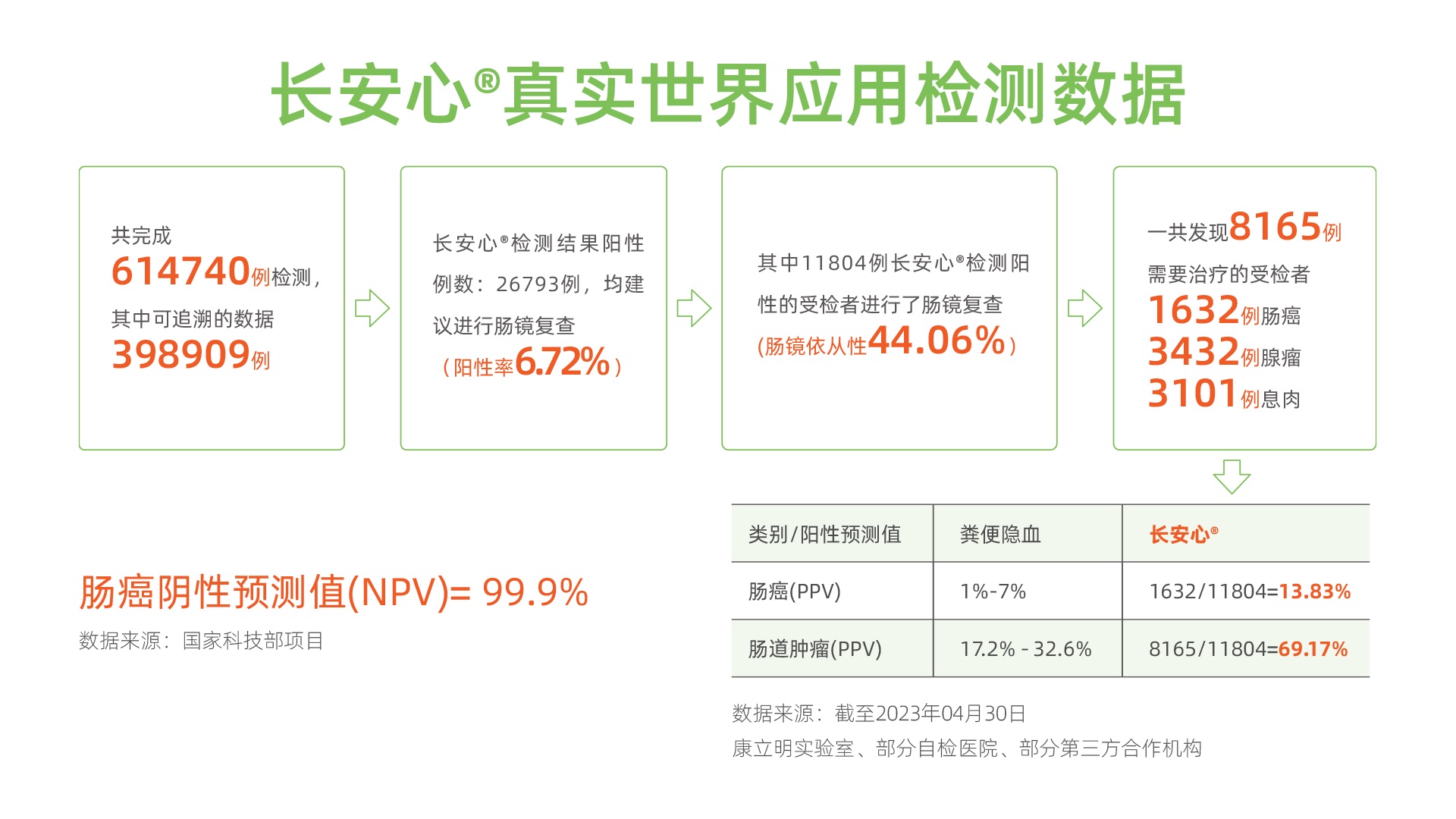 在“人類健康,我之使命”崇高理想下,發(fā)揚(yáng)康立明生物的社會(huì)責(zé)任與擔(dān)當(dāng)精神,以長(zhǎng)安心®等腫瘤早篩產(chǎn)品的優(yōu)越性能,引領(lǐng)行業(yè)的技術(shù)標(biāo)準(zhǔn),創(chuàng)新的公共衛(wèi)生篩查模式,加大人群的參與度來(lái)實(shí)現(xiàn)腫瘤的早診早治。來(lái)自康立明醫(yī)學(xué)檢驗(yàn)實(shí)驗(yàn)室、部分自檢醫(yī)院、部分第三方合作機(jī)構(gòu)的數(shù)據(jù)顯示:截至2023年4月30日,長(zhǎng)安心®共完成614740例檢測(cè),其中可追溯數(shù)據(jù)398909例。長(zhǎng)安心®檢測(cè)結(jié)果陽(yáng)性數(shù)26793例(陽(yáng)性率6.72%),均建議進(jìn)行腸鏡復(fù)查,其中11804例長(zhǎng)安心®檢測(cè)陽(yáng)性受檢者進(jìn)行了腸鏡復(fù)查(腸鏡依從性44.06%)。