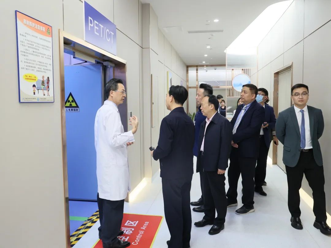 白書忠部長一行首先參觀了醫(yī)院門診大廳、影像科、國際醫(yī)療部、放療中心等,了解各科業(yè)務及各功能區(qū)域的基本情況。影像科主任周智洋主任詳細介紹了科室設備、人員配置,醫(yī)療服務內(nèi)容等基本情況,并著重介紹了前海人壽廣州總醫(yī)院區(qū)域首臺PET-CT設備及取得的良好成效。